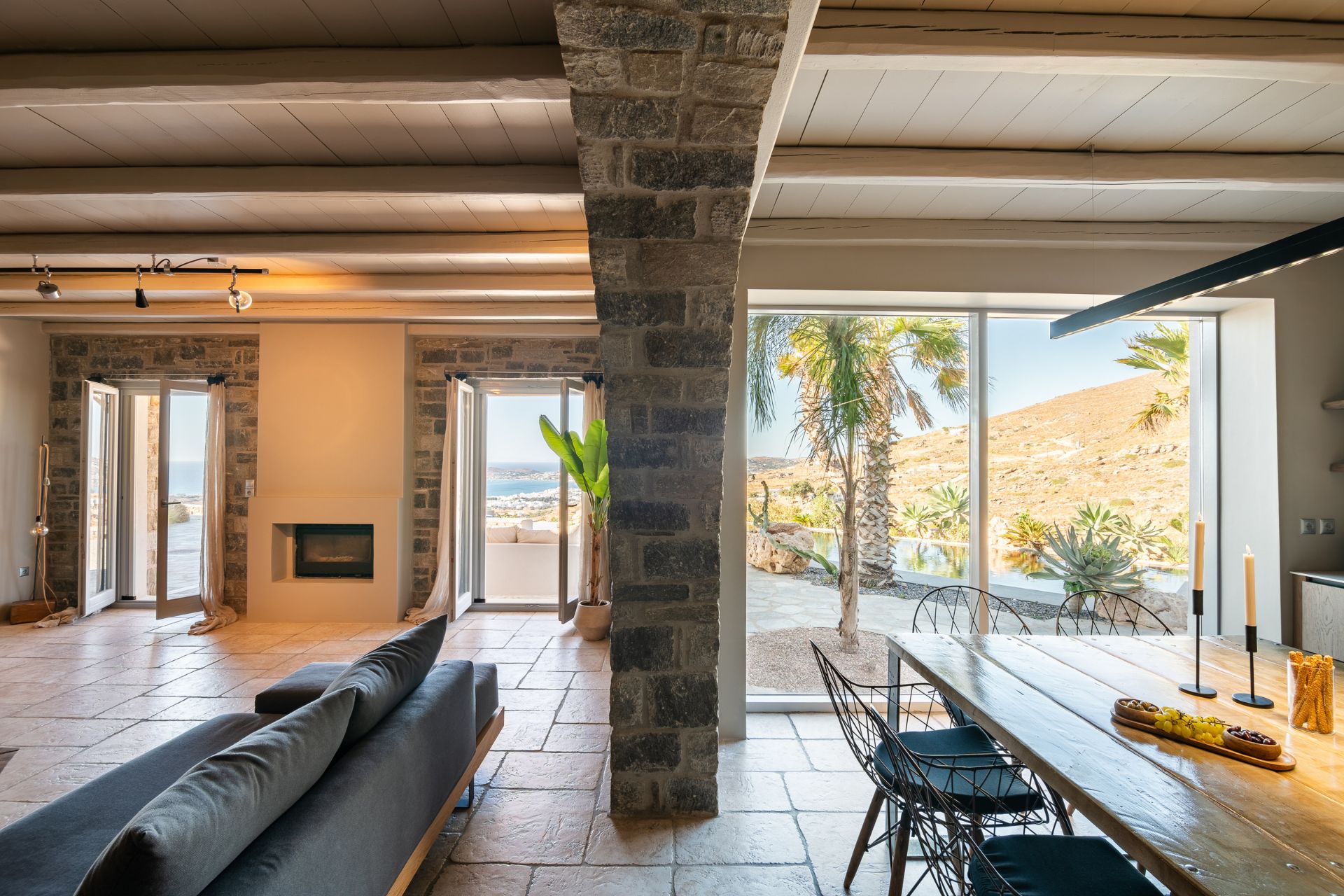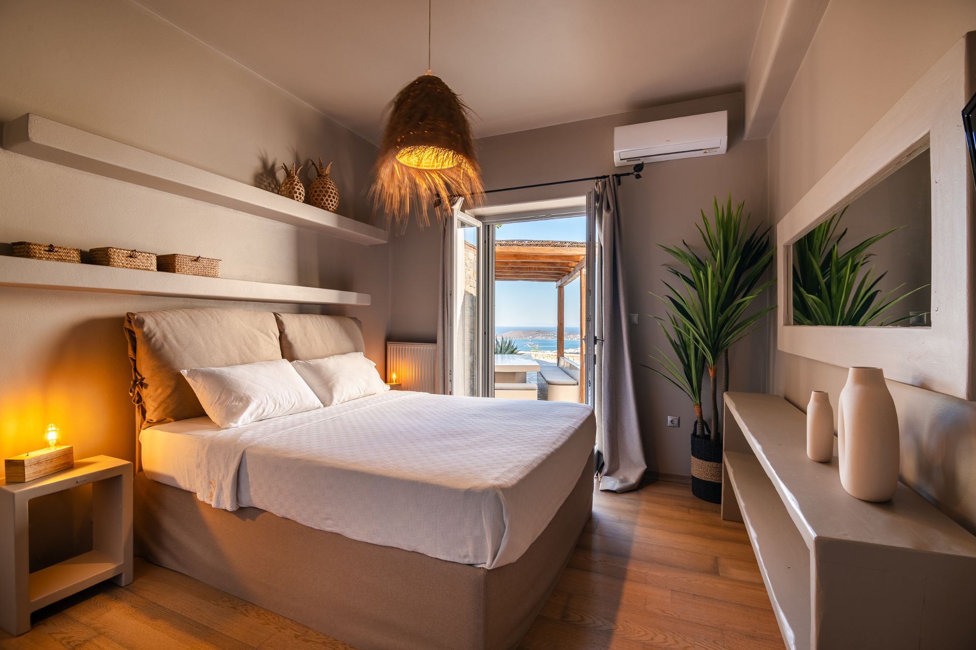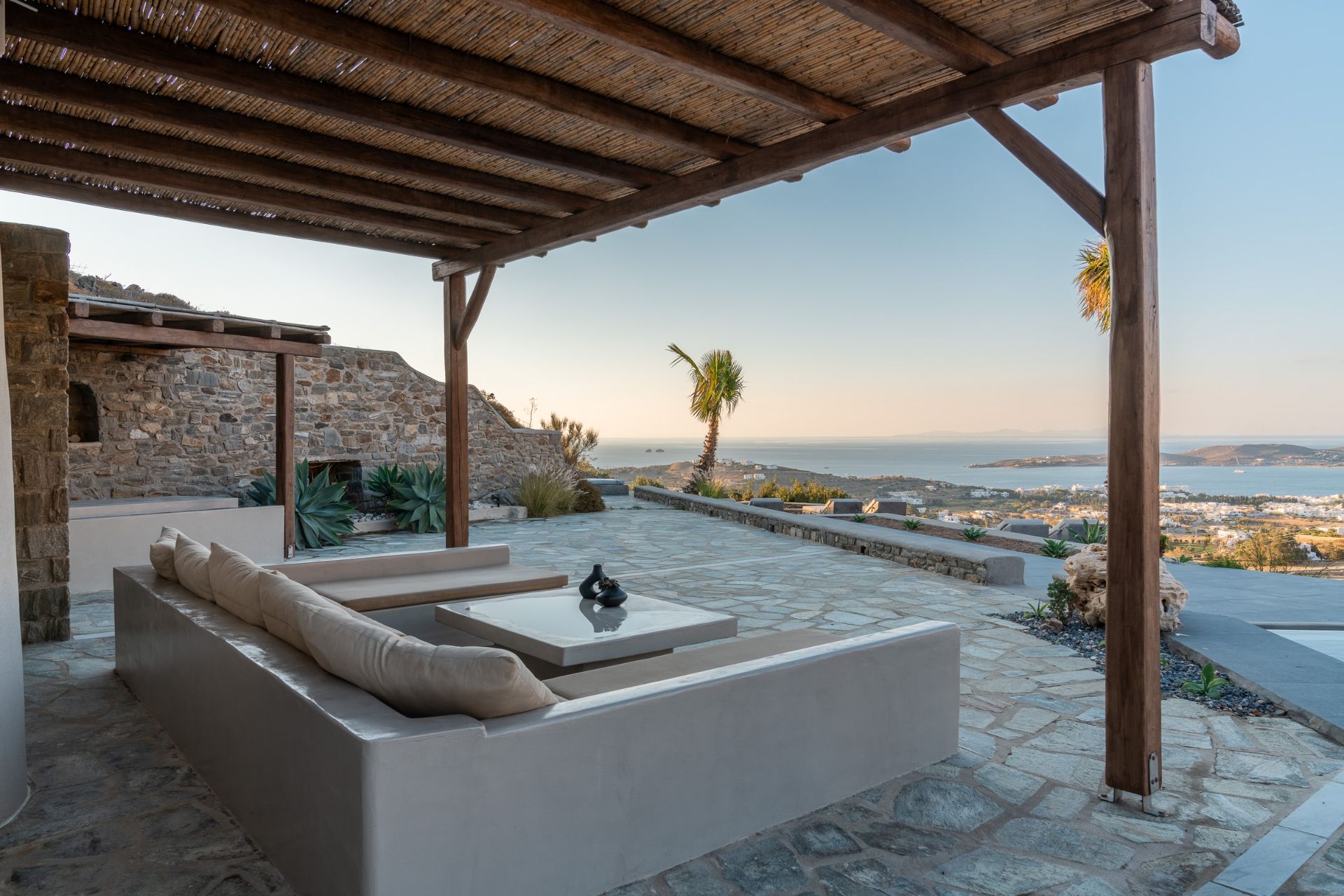 The outdoor spaces at Villa Delphinus are designed to make the most of Paros’ natural beauty. A large private pool overlooks the Aegean Sea, with a spacious sun-soaked terrace perfect for al fresco dining and lounging. Whether you choose to swim, relax by the pool, or enjoy a BBQ with your loved ones, the outdoor oasis promises unforgettable moments of relaxation with stunning sunset views over Parikia.