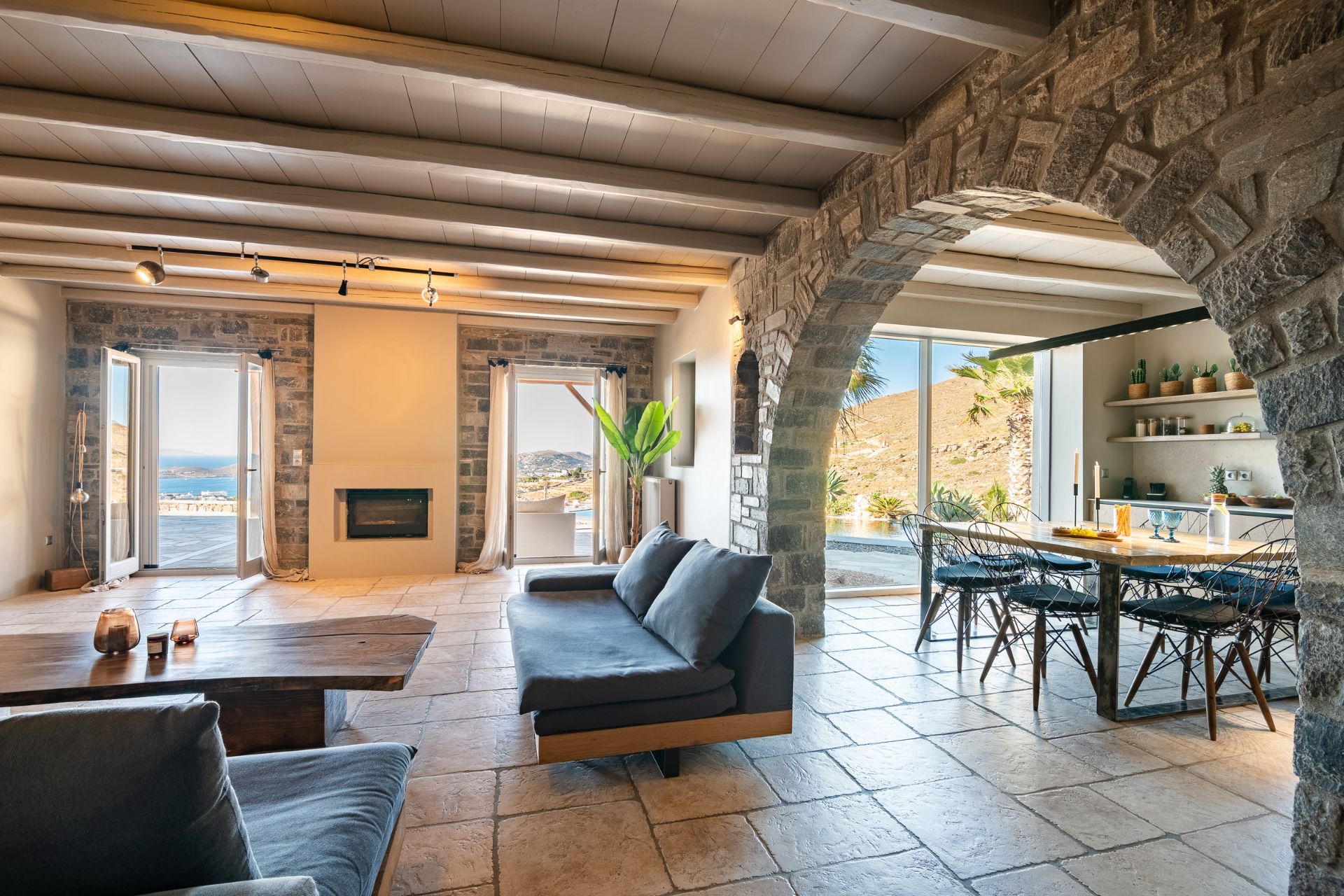 Villa Delphinus offers a multi-level layout, providing ample space for privacy and shared experiences. The ground floor features a bright living room with expansive windows, offering panoramic sea views, a fully equipped kitchen, and a dining area. The two bedrooms on this level each come with private bathrooms and sea views, perfect for waking up to the beauty of Paros.