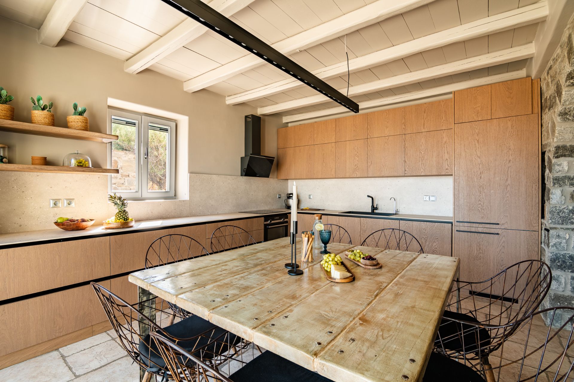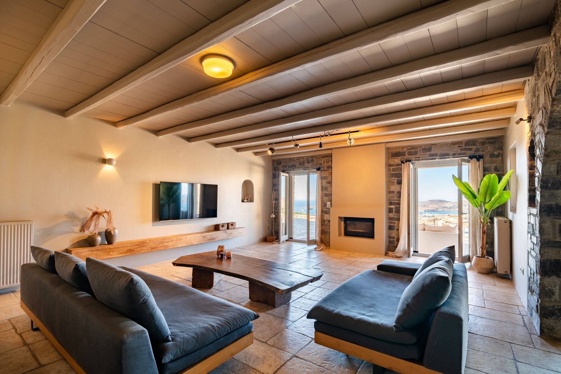 On the first floor, you’ll find two more elegantly appointed bedrooms and a shared bathroom, leading out to a veranda that boasts unparalleled views of the Aegean. Whether enjoying your morning coffee or evening drinks, this space offers the perfect spot to unwind.